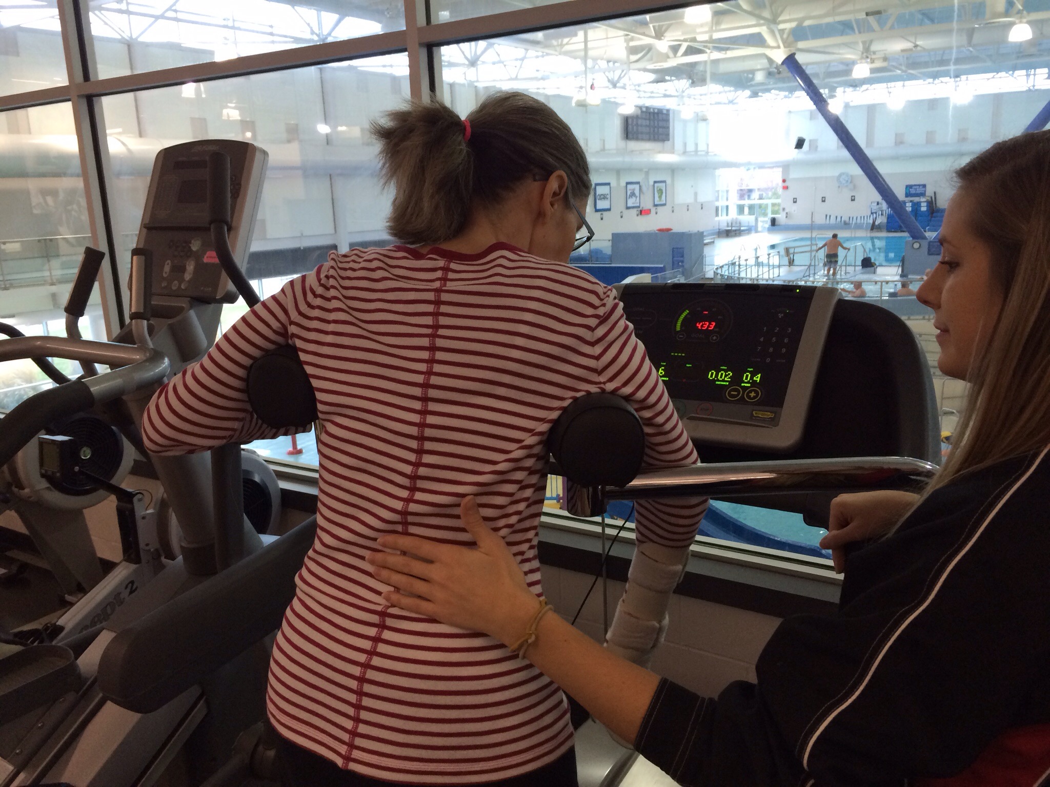 Another new piece of equip for Janet surprisingly is a treadmill. H2O has one with a couple of arm supports that let Janet concentrate on taking nice long steps without worrying about balance. It’s a brilliant idea that I think will really improve the mechanics of Janet’s walking.
