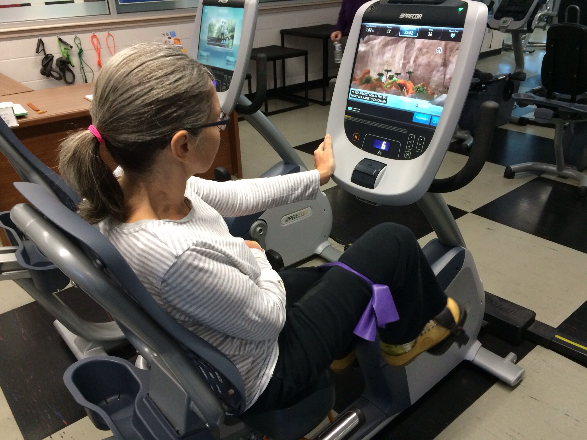 The recumbent bike at H2O is way cooler than the one at Connect except for the pedals. This is a recurring problem as every other bike we’ve seen has pedals too small to strap Janet’s right foot onto. Alyssa came up with the idea of putting a band around Janet’s legs to prevent the right one from flailing outward like it wants to. This enables Janet to push harder with her right leg therefore keeping it on the pedal. So far so good and Janet likes the idea of being able to watch tv while riding. Now if there was only anything on worth watching.