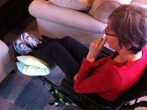 Janet had a good stretching session in the gym with Curtis this morning then I picked her up for the weekend and we hung out at home with my mom who baked up a storm and made the place smell real nice. After Janet’s nap she helped make dinner again and amongst other things is showing an increased ability to stand for long periods. She moved around the house well without her cane and enjoyed just chilling in her comfy home.